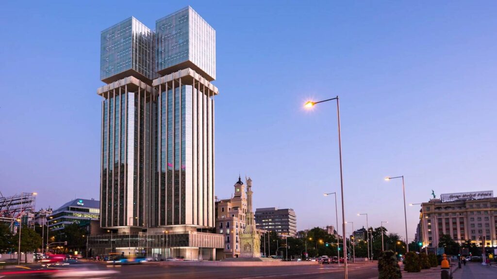 No es el más alto, ni lo fue en su momento; tampoco ahora serán dos torres, sino una. Ni siquiera iba a ser un edificio de oficinas. Y quién iba a decir que perdería su elemento más reconocible, el enchufe art decó que lo coronaba. Menos aún que precisamente esa seña de identidad no estuviera contemplada ni por asomo en el proyecto original. En fin, que, con semejante historial, ya podemos intuir que estamos ante un proyecto especial. Seguramente el más cambiante y uno de los más controvertidos de España. No en vano, ya lo fue en sus inicios, cuando miles de madrileños vieron como sus 20 plantas iban creciendo de arriba abajo.