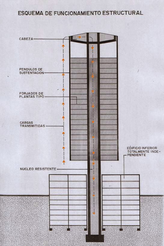 “Imaginémonos que la taza tuviera un soporte vertical como base, como una copa. Las cargas suben por las péndolas pretensadas que rodean la fachada (que sería el cuenco de la copa), y que se comprimen contra la cabeza de la torre (la servilleta). Luego bajan por el núcleo central (el fuste de la copa). Es decir, el edificio no cuelga hacia abajo, sino que se comprime hacia arriba, contra la cabeza. Funciona al revés de la construcción tradicional, lo que permite, en las tres plantas basamentales comerciales y en el garaje, liberar espacio libre, sin pilares”.