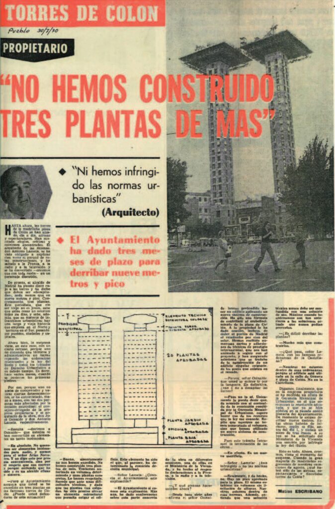 El problema llegó en 1970, con los núcleos terminados y las cabezas en construcción: el 7 de Julio, el alcalde de Madrid, Carlos Arias Navarro, decidió paralizar las obras y ordenar la demolición inmediata del proyecto “por no ajustarse a la ordenación aprobada y considerar inadmisible un aumento de la altura y del número de viviendas”. Antonio Lamela siempre achacó esta decisión a motivaciones políticas y al ansia de notoriedad de Arias Navarro, quien ya se postulaba para la presidencia del Gobierno.