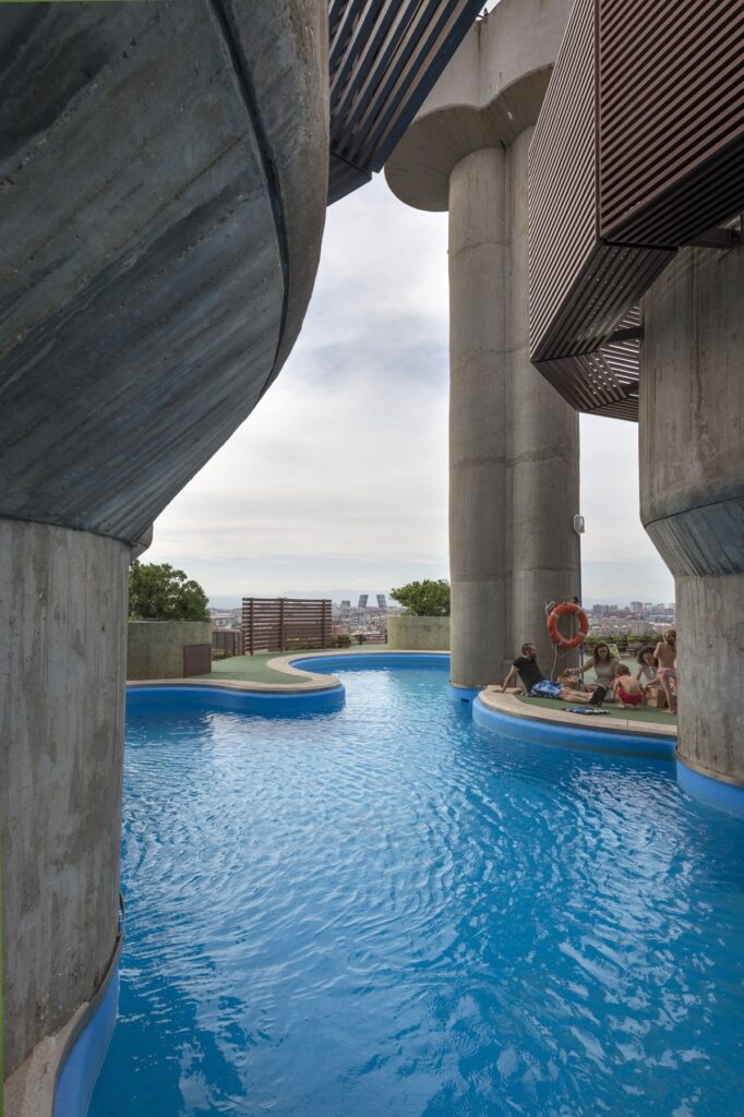 En esa concepción organicista y de ciudad vertical, la vida debía fluir a lo largo del edificio, entendido como un todo con vida, autónomo y casi autosuficiente. Por eso todas las casas se diseñaron como viviendas unifamiliares apiladas con jardín; sus formas curvas seguían las leyes de la naturaleza y, además, debían contar con una serie de zonas comunes destinadas a proveer de servicios a sus habitantes. Así, se llegaron a proyectar montacargas que transportaban directamente la comida desde el restaurante situado en la planta superior hasta cada uno de los apartamentos. Y precisamente, en lo alto, iba a haber una exclusiva zona comercial, una peluquería y una piscina. De todo aquello, solo se materializó la piscina, como una lago natural, un oasis sinuoso que discurre entre hormigón sobre el tráfico incesante de Madrid.