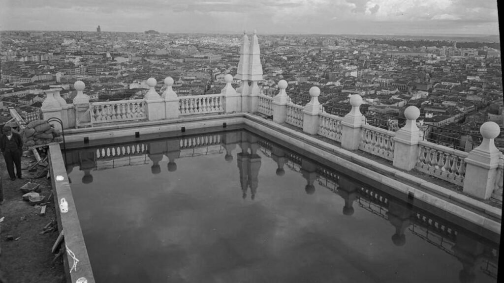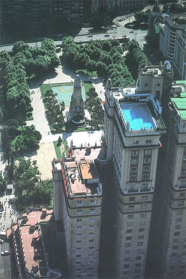 El Edificio España enseguida se convirtió en un centro social y de negocios imprescindible para la capital y, entre sus atractivos, se encontraba una espectacular piscina situada en uno de sus cuerpos laterales y orientada a la fachada trasera de edificio. Esta piscina tuvo el mismo éxito que el resto del hotel y en sus tumbonas se daba cita la flor y nata de la alta sociedad madrileña. Vista aquella piscina, sigue sorprendiendo la simple balaustrada que separaba a los bañistas del vacío y la cercanía del agua a la fachada. Una fachada, la posterior, que es mucho más interesante que la principal y que llegó a perder su protección en 2014 durante las controvertidas modificaciones del Plan de Ordenación Urbana que acometió el Ayuntamiento de Madrid.