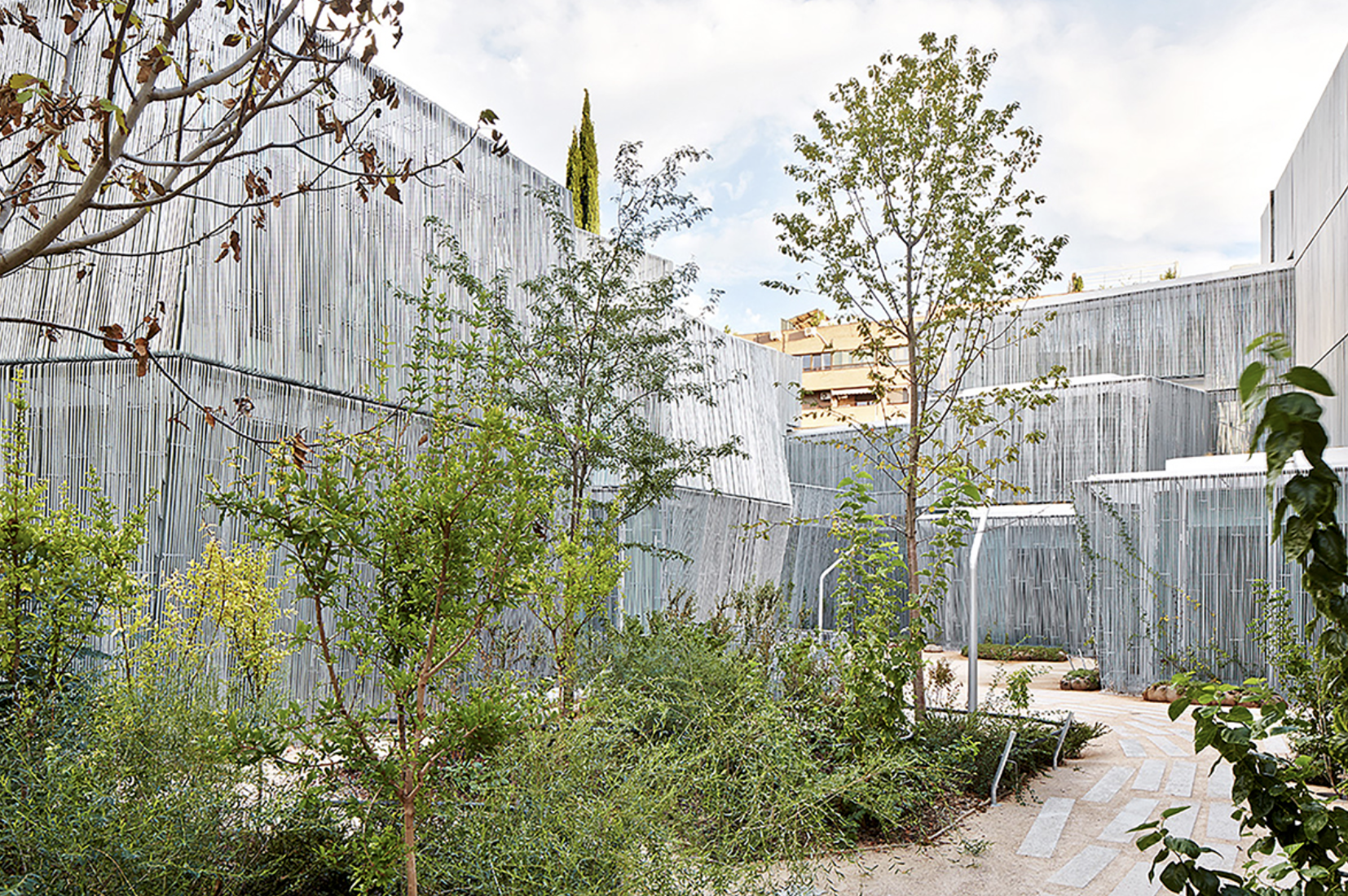 De hecho, ya desde la entrada, la celosía de varillas que cambian aleatoriamente su grosor y su distancia llama la atención por su aspecto casi textil, como si hubiesen extendido un puñado de cuerdas y las hubiesen ordenado, una al lado de la otra, para cubrir los volúmenes de formas rotundas que se insinuan bajo la piel metálica. Un trabajo sin convencionalismos llevado a cabo por Amid cero9 que recupera el jardín como elemento histórico y aporta una estética inconfundible que ya forma parte de la identidad de la Fundación.