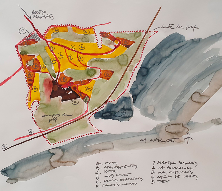 Así se explica la perfecta integración de nuestro resort Palmares. Porque sus volúmenes y sus colores se fundamentan en un procedimiento orgánico. En las acuarelas expuestas en VETA, asistimos a una idealización del proyecto, en su más puro sentido de “idea”. En ellas, las anotaciones se entrelazan con las pinceladas sobre el papel y los tonos ocres se mezclan con el azul del océano. Una serie de mapas, croquis y estudios de paisaje que transmiten la riqueza natural de la costa sur de Portugal, de sus playas y de las tonalidades que percibiríamos si arribásemos en barco o la sobrevolásemos en avión. Un ejercicio de abstracción destinado a convertirse en pura concreción; la misma que hoy podemos ver materializada en el Clubhouse, los Signature Apartments o la Signature Villa 19. Construcciones que emergen de la tierra como estratos geológicos y que convierten Palmares en parte del Algarve.