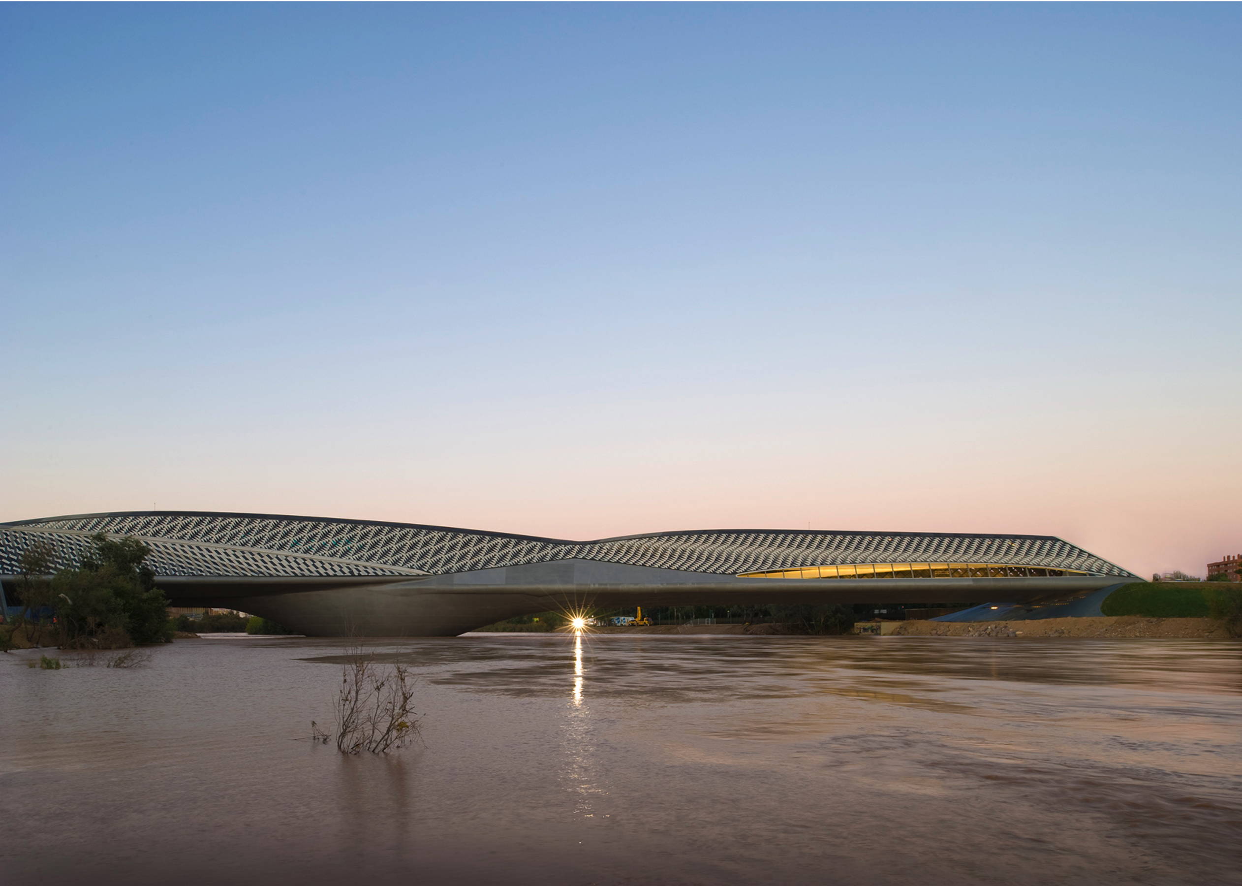 La sección romboidal se despliega sobre una línea curva para adquirir su volumen y disponerse en varias vainas que dividen el espacio interior. De esta manera, la función estructural permite también dividir las áreas de exposición y las separa gracias a los estrechamientos intersticiales que acotan cada zona. A lo largo de su recorrido, se alternan dos realidades: los espacios cerrados, que invitan al recogimiento, y los abiertos, pensados para contemplar y relacionarse con el rio.