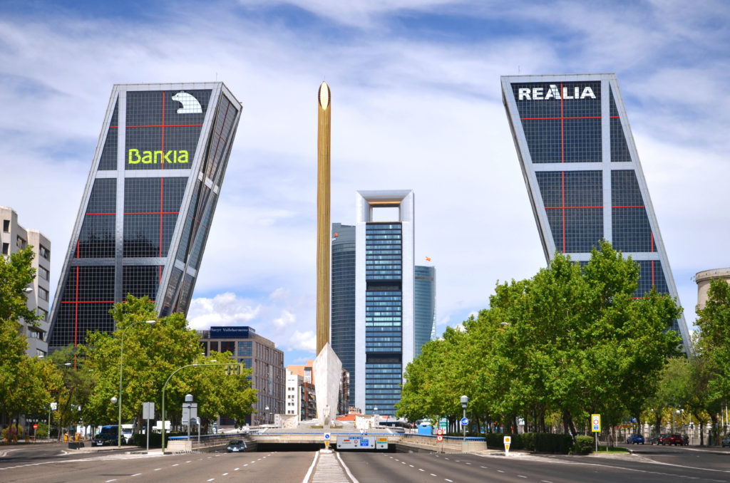 Estas dos torres gemelas situadas en la plaza de Castilla fueron diseñadas por Philip Johnson y John Burgee y su construcción se demoró desde 1989 hasta 1996. Encargadas por Kuwait Investment Office (KIO), fueron los primeros rascacielos inclinados del mundo. El secreto de su inclinación de 15 grados es un núcleo central de hormigón y acero que recorre verticalmente cada torre desde su ángulo obtuso inferior hasta el obtuso superior, detalle que queda marcado en el exterior por una franja metálica que sigue el mismo recorrido.  A pesar de que su nombre oficial es Puerta de Europa, todo Madrid las conoce por el nombre de su promotora original.