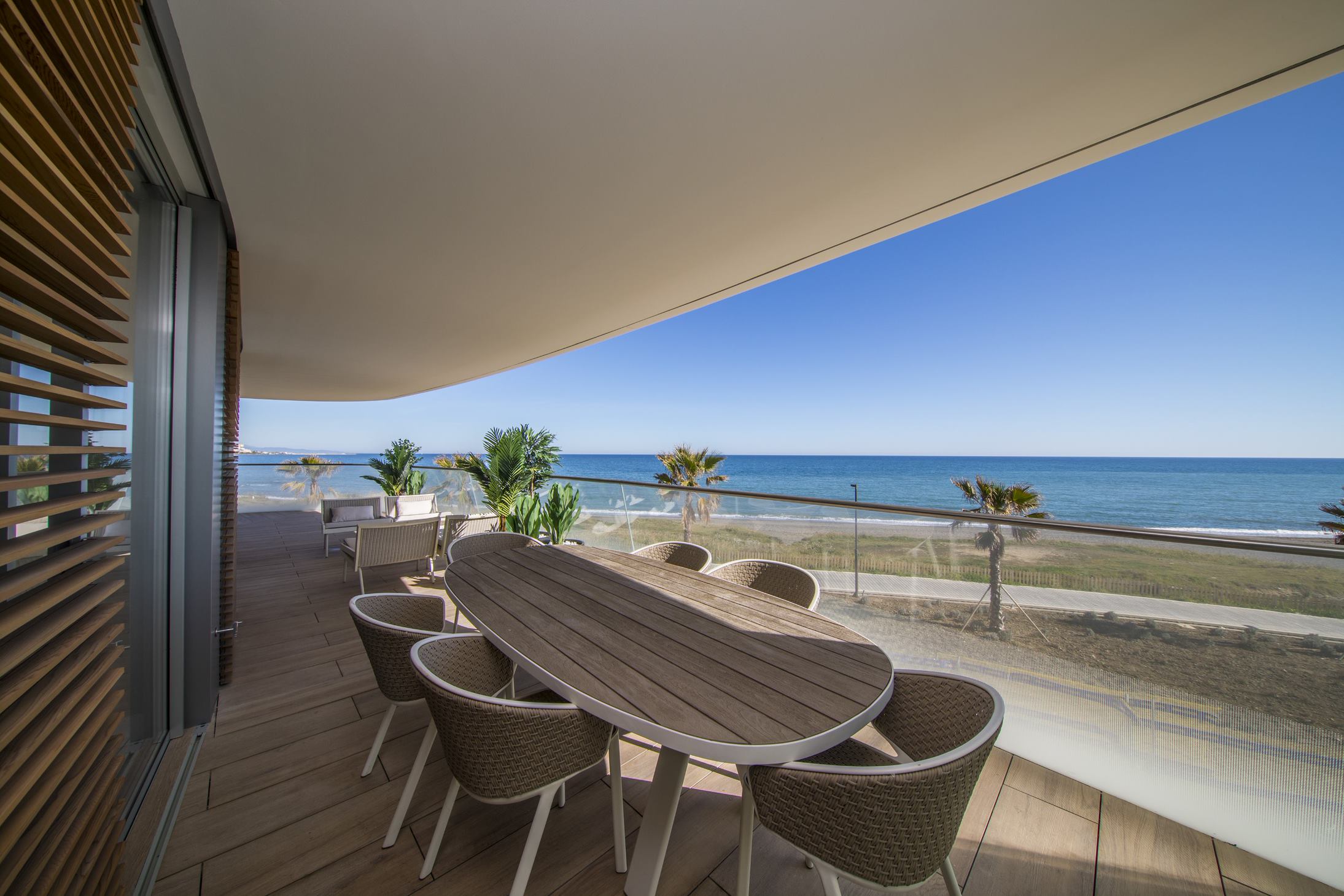 Por eso, cuando vimos las primeras propuestas, supimos que habíamos acertado. De La-Hoz planteo un edificio con claras reminiscencias náuticas, asentado a la orilla del Mediterráneo y mimetizado gracias a sus formas orgánicas. Una arquitectura vanguardista, cuyos espacios fluyen para eliminar las fronteras entre el exterior y el interior: grandes cristaleras y espectaculares terrazas se abren al mar en torno a un jardín que se funde con la arena. Sus piscinas infinity buscan la línea del horizonte y, en lo alto de los edificios, los áticos simulan la cubierta de un velero, cada uno con su propia piscina privada.