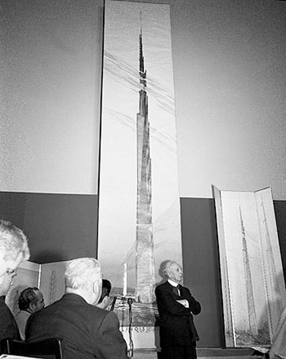 Lo que sí consiguió Wright, a quien la publicidad se le daba muy buen, fue una gran repercusión mediática. En 1956 convocó a la prensa para anunciar el gran proyecto y, posteriormente, organizó una conferencia con la que recaudó 25.000 dólares para su estudio. De aquel acto se sacó en claro dos cosas: su función, ser la sede del gobierno de Chicago; y unos números de escándalo: 1.730 metros, si contamos la antena, 528 plantas, 76 ascensores impulsados por energía atómica, un aparcamiento para 15.000 coches y otro para 100 helicópteros. Y todo en 1.715.000 metros cuadrados de superficie total, o en palabras de Wright: “El Empire State será un ratón en comparación”.