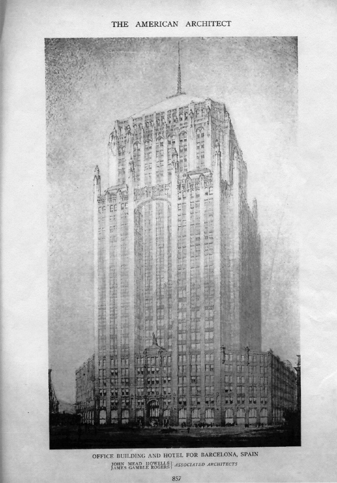 Para hacerlo posible, este grupo de promotores contó con los arquitectos adecuados, los estadounidenses John Mead Howells y James Gamble Rogers. Entre los dos, diseñaron un rascacielos al gusto neogótico de la época. Un pedazo de Chicago en plena Barcelona. Es más, para hacernos una idea de la envergadura de proyecto y del prestigio de sus autores, basta decir que la icónica sede del Chicago Tribune, con sus 141 metros de altura, es también obra de Howells y se empezó a construir en 1923. Con solo diez metros menos y un porte impresionante, el Edificio Sellés-Miró habría supuesto un verdadero hito en la arquitectura europea.