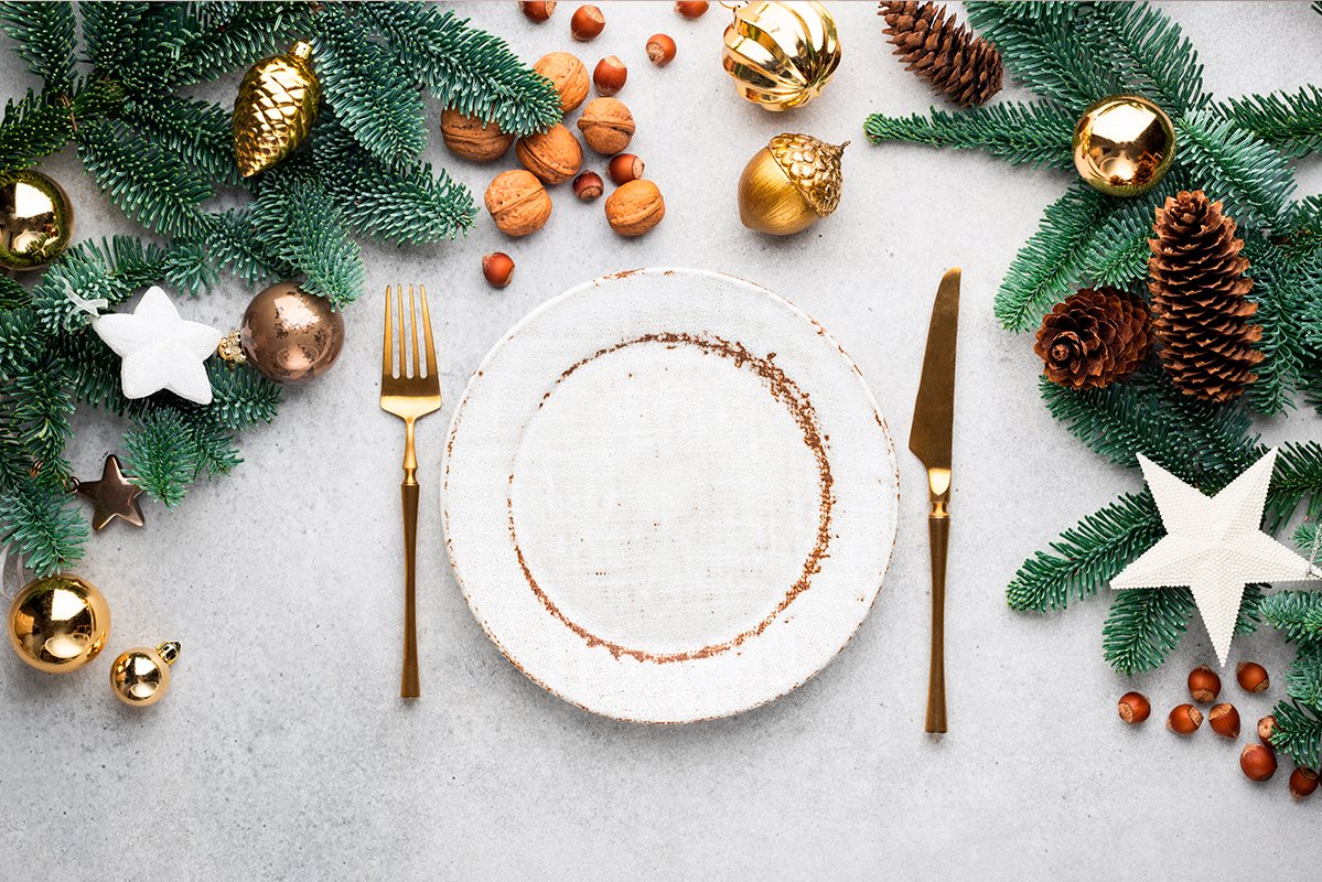 Los elementos naturales como las ramas de pino, las bayas rojas y las hojas de acebo, añadirán un toque festivo y original a tu decoración. Pueden formar parte de arreglos florales o decorar los servicios de los comensales.