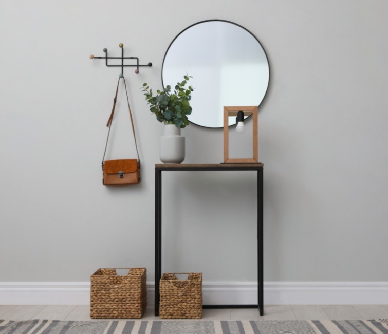 Su formato sencillo y minimalista permite que la acompañemos con un espejo y un perchero que harán de nuestra entrada un rincón elegante y útil, lo primero que veremos al llegar a nuestra casa.