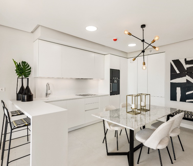 Si quieres ir más allá busca otros elementos como una mesa o una barra para tus desayunos o comidas. Los colores que te recomendamos son gris, beige y blanco.