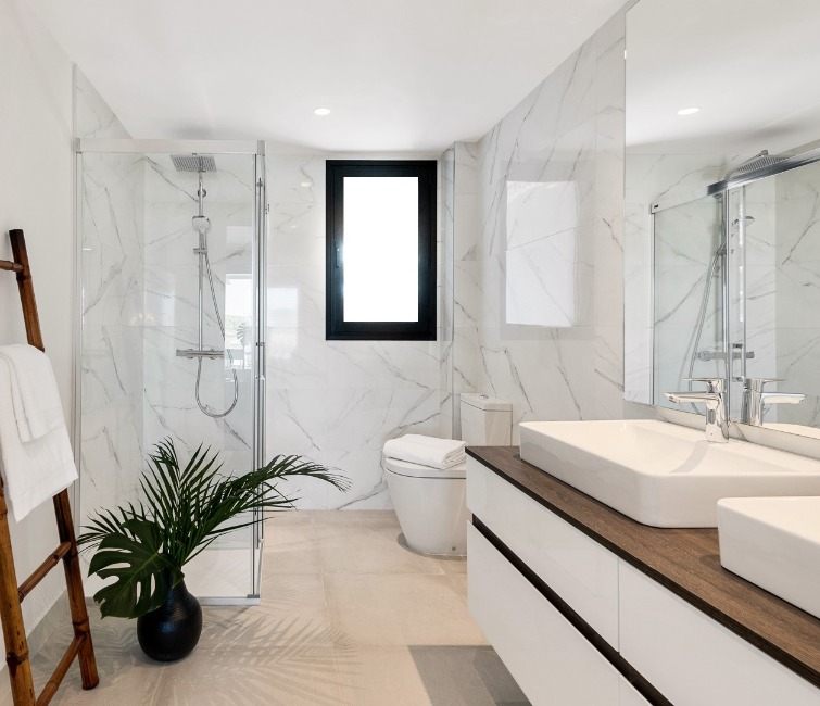 Otro lugar donde puedes aprovechar todo el potencial del mármol es el baño. Este material se adapta muy bien al estilo moderno y minimalista. Para un efecto más llamativo, puedes emplear mármol negro. Aporta un efecto visual impactante y es ideal para baños de mayor tamaño. Para evitar una sensación de oscuridad, usa una iluminación LED indirecta.