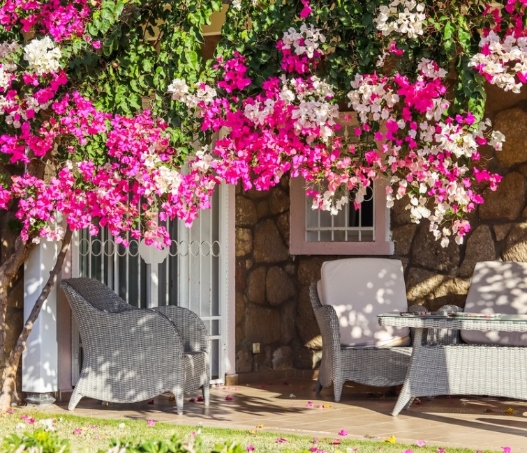 Ahora nos vamos al otro extremo: sol, sol y más sol, así que te recomendamos especies capaces de resistir la insolación directa. La salvia, por ejemplo, es siempre una elección aromática acertada, junto con los cactus o los ágaves, que son una opción perfecta por su resistencia y bajo mantenimiento. No obstante, también funcionan otras plantas con una floración más espectacular como la Estepa ladanífera, también conocida como Jara, o las buganvillas, las petunias, las zinnias, los geranios y los narcisos.